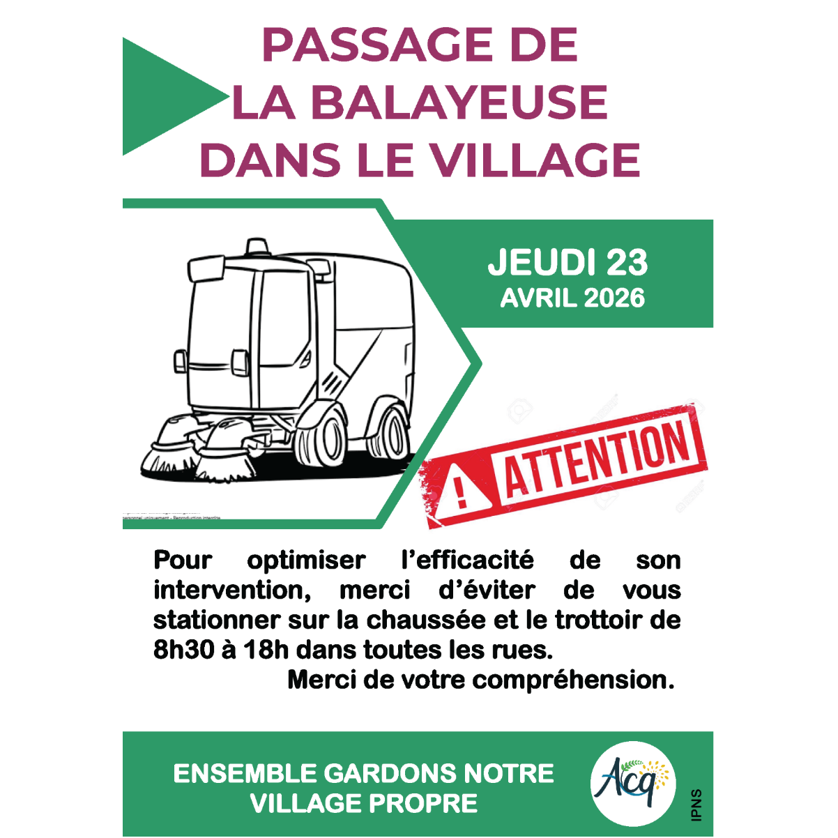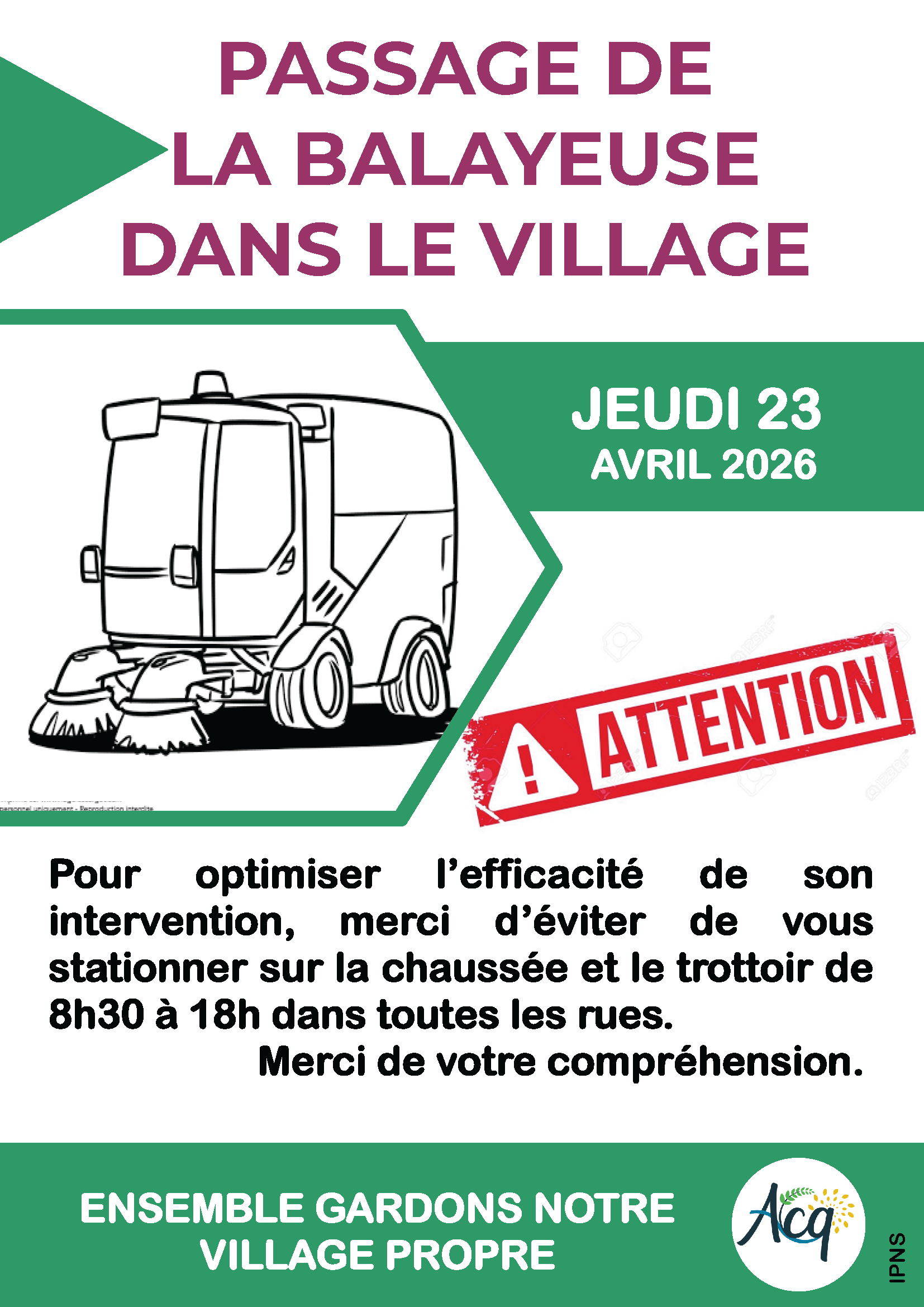 La balayeuse passera dans le village le jeudi 23 avril 2026.